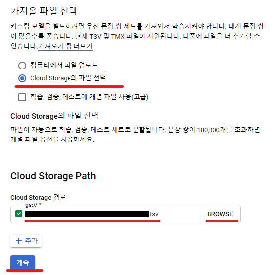 .tsv파일을 스토리지에 올려 두었기 때문에 해당 파일을 선택 해 줍니다.