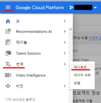 Google Cloud Platform 에서 좌측메뉴 클릭 후 하단의 번역 -> 대시보드 로 들어갑니다.