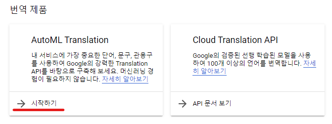 여기서 AutoML Translation 이 있는데 시작하기를 눌러 줍니다.