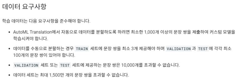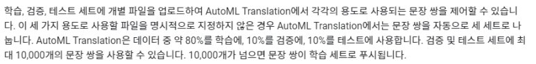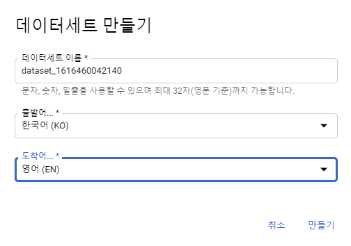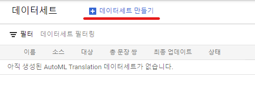 AutoML Translation 관련하여 아무것도 없기 때문에 데이터 세트 만들기를 해 줍니다.