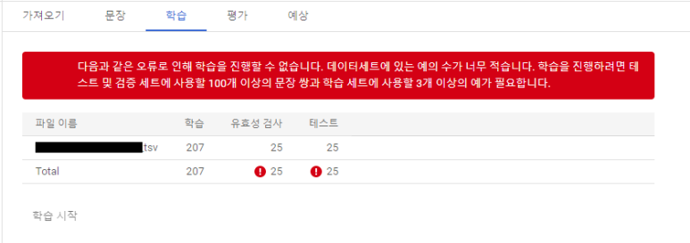 학습탭으로 넘어가 보게 되면 데이터 부족으로 학습을 진행 할 수 없습니다.