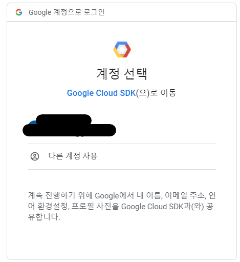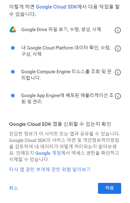 권한요청이 뜨게 되는데 Google Cloud SDK 에서 권한을 요청합니다.