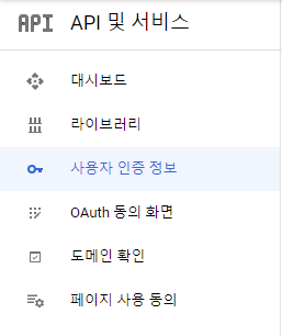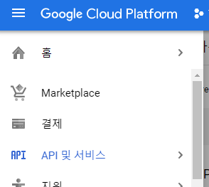 구글 클라우드 콘솔에서 API 및 서비스로 들어 갑니다.
