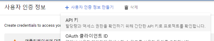 +사용자 인증 정보 만들기를 누르고 API 키를 선택해 줍니다.