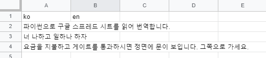 일단 번역에 활용할 문장을 구글 스프레드 시트에 만들어 줍니다.