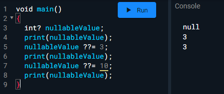 초기 할당에서는 null이기 때문에 3이 할당 되었지만 10을 할당 하려 했을 경우 null이 아니기 때문에 할당되지 않았습니다.