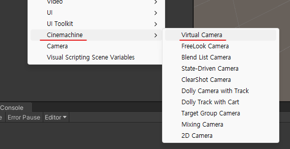 Hierarchy 창에서 우클릭을 하면 객체 추가를 할 수 있는데 리스트 상에서 Cinemachine->Virtucal Camera를 선택 해 줍니다.