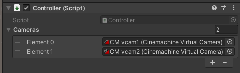 그리고 Inspector상에 가서 리스트 객체를 2개 만들어 주고 아까 생성했던 VirtualCamera를 모두 할당 해 줍니다.