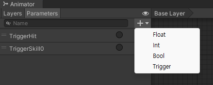 Animator 창에서 Animation Controller를 보게 되면 Parameters 탭이 있는데 여기서 Transition에서 사용할 parameter 들을 설정 할 수 있습니다.