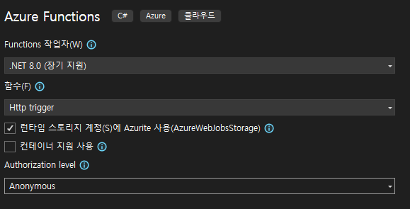 함수 이름을 선택하고 나면 Azure Function 설정창이 나오게 됩니다.