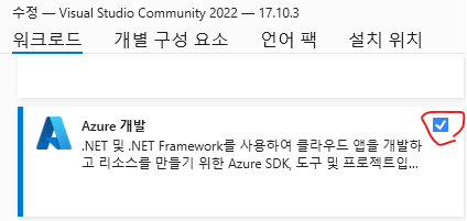 항목중에 Azure 개발 항목이 있는데 설치해 줍니다.
